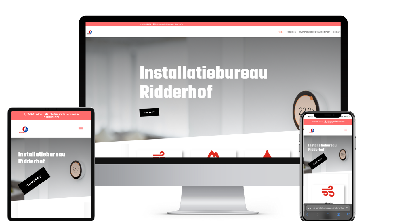 Voor Installatiebureau Ridderhof heb ik een complete visuele identiteit ontwikkeld. De eigenaar, een installatiemonteur die naast zijn baan voor zichzelf wilde beginnen, had nog geen online aanwezigheid. Ik heb een logo en website gemaakt om hem vindbaar en professioneel over te laten komen. Ook regel ik de hosting en het technisch beheer, zodat hij zich volledig kan focussen op zijn vak.